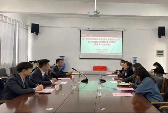 为进一步落实2023届高校毕业生春季促就业攻坚行动,加强校企战略合作,深化产教融合发展, 3月27日上午,williamhill英国威廉希尔与贵州恒邦天府房地产开发有限责任公司校企合作洽谈会在建工公司A504会议室顺利举行。四川恒邦天府集团贵州区总经理范紫微、营销中心总经理鲁赟、人力资源部部长叶嘉文、行政部部长刘峰瑜,建筑工程公司党委书记何璘、建筑与规划系主任舒净、系副主任陈玫、办公室负责人余进江出席会议,会议由公司党委副书记陆忠婷主持。