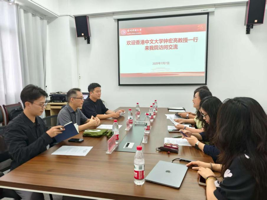 2025 年 7 月 7 日下午,香港中文大学建筑公司钟宏亮教授、韩曼老师及博士生陆淳风一行到公司访问交流,双方在公司 B506 会议室就团队建设、人才培养、乡村振兴实践及未来合作等议题进行交流座谈。公司党委书记何璘,副经理尹新雅出席座谈会,建筑与规划系副主任谢振宇,建筑设计教研室主任黎昌伦,城乡规划专业熊媛老师参加会议。座谈会由何璘书记主持。