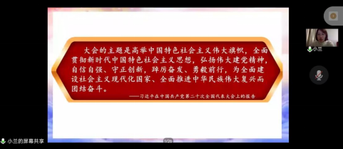 兰图老师的授课内涵丰富,以开阔的视野精准深入的阐释党的二十大精神,使全体师生党员深受教育,备受感动,对全面建设社会主义现代化国家和实现第二个百年奋斗目标的重大部署有了更为深刻的理解和把握。我们生逢盛世,在新时代的征程上我们要时刻牢记作为一名共产党员的义务和权利,始终严格要求自己,我们要切实把思想和行动统一到党的二十大精神上来,忠诚履职、开拓进取,在新时代新征程上展现新气象新作为,为全面建设社会主义现代化强国、实现中华民族伟大复兴的中国梦作出更大贡献