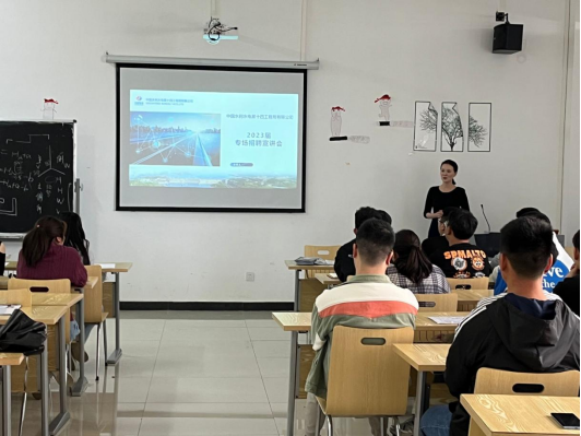 何璘书记在宣讲会开场感谢用人单位给公司员工提供的优质平台,向用人单位详细介绍了公司团队和专业办学等情况,并表示公司与中国水利水电第十四工程局有限公司的校企合作,有助于建工学子高质量就业,有利于企业吸纳优秀毕业生,增进双方的互利共赢。招聘会上,中国水利水电第十四工程局有限公司负责人通过播放宣传视频向毕业生们展示企业风采,再通过PPT从企业发展历程、人才培养体系、签约流程等方面进行宣讲。